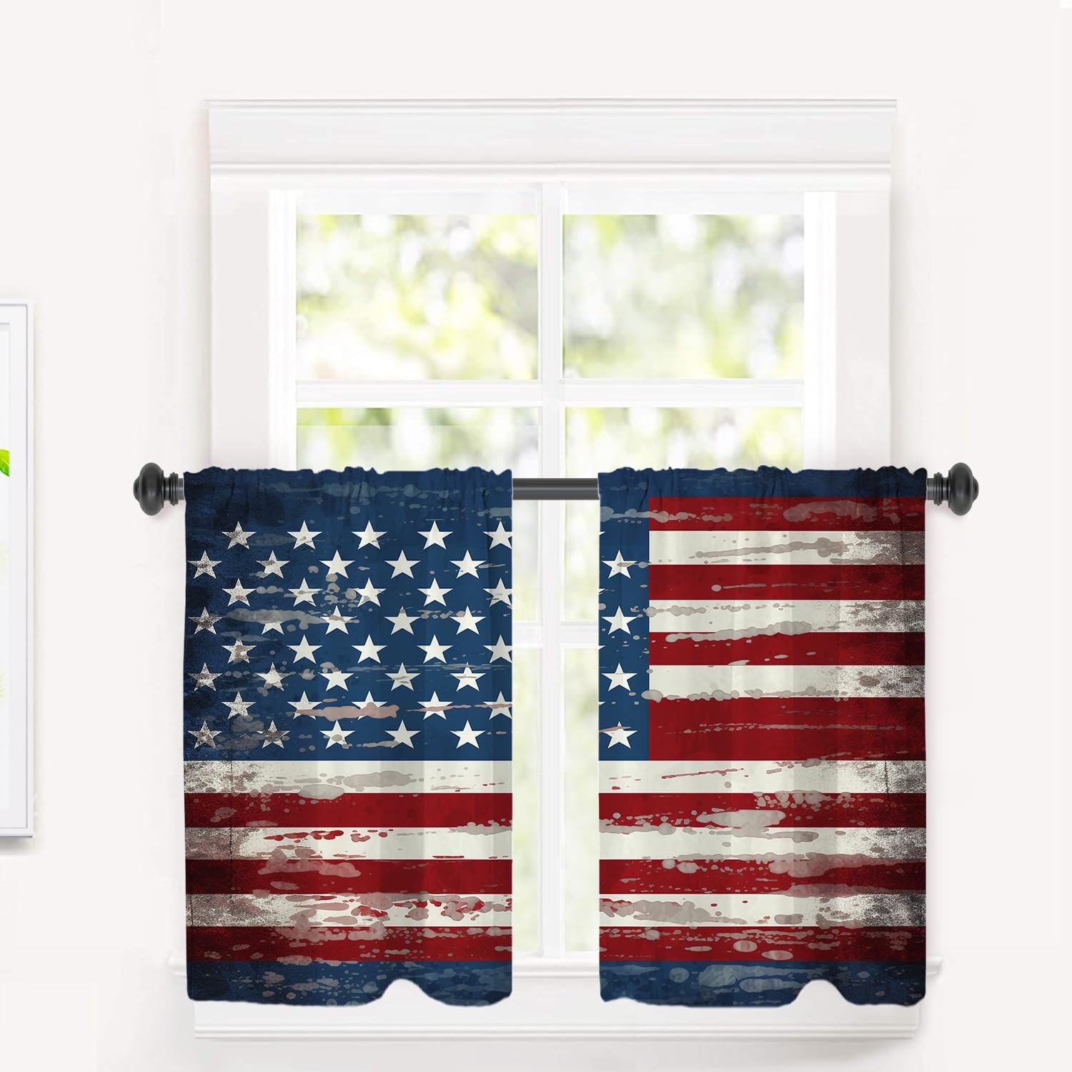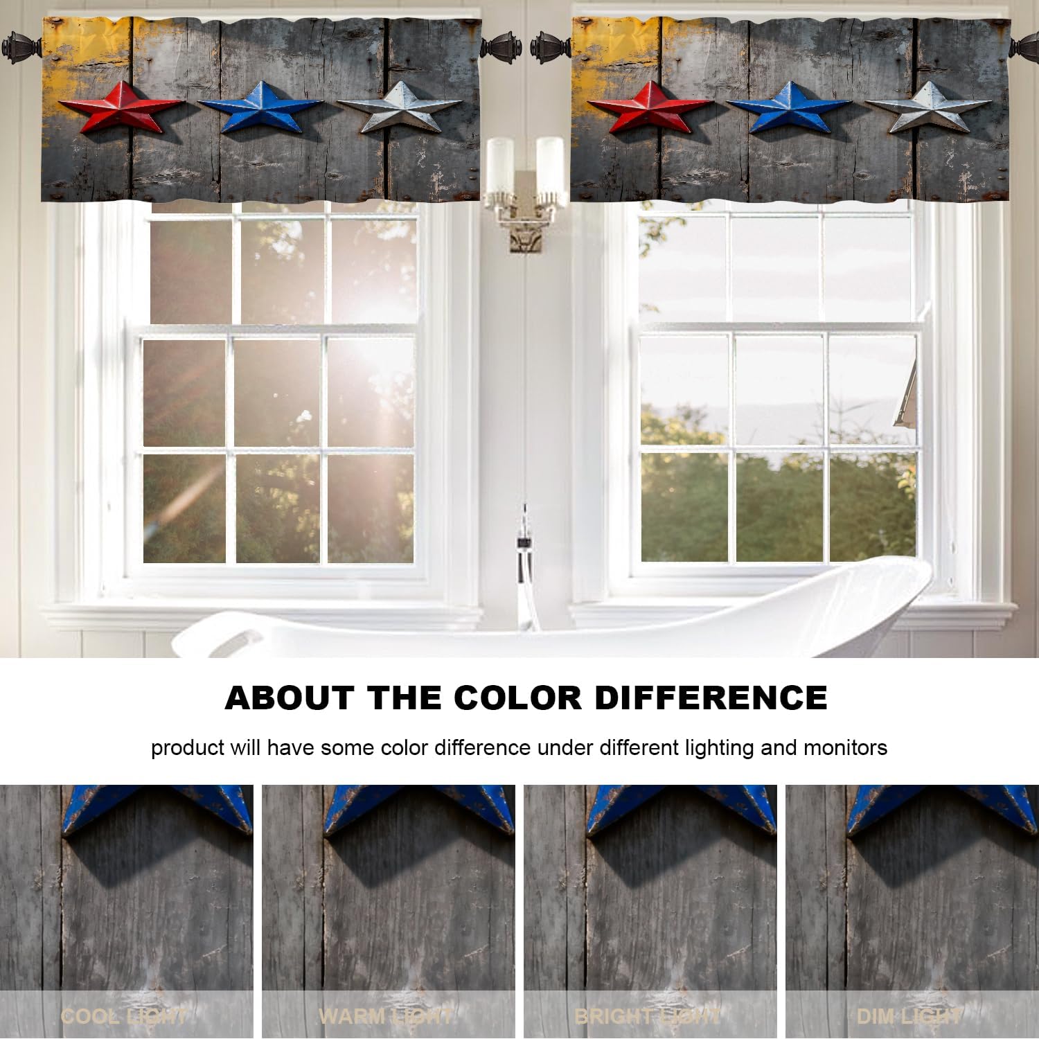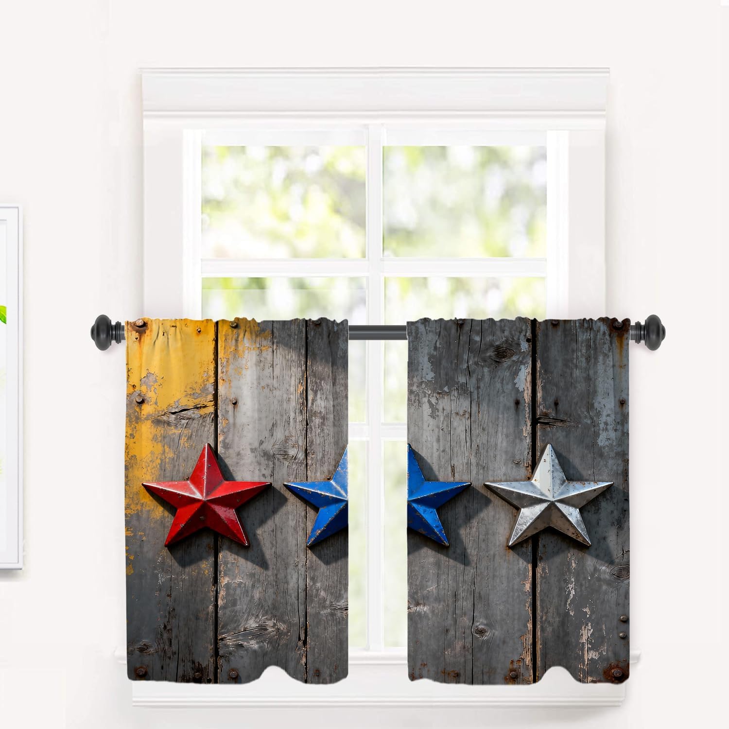 Red White Blue Stars Country Kitchen Valances for Windows,Grunge Grey White Wood Blackout Valances Curtains Multilayer Polyester Drapes for Kitchen Bedroom 2 Pack 52X16 Inches