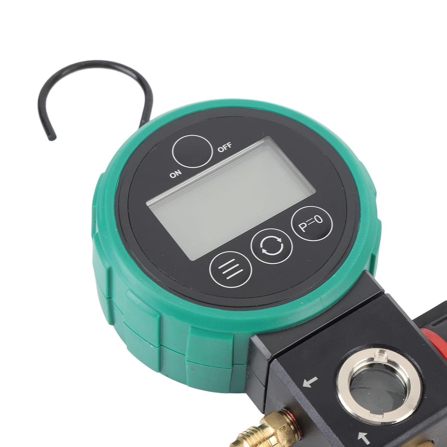 1. EASY TO USE: Digital HVAC uses micro power single chip microcomputer to save power; Valve body adopts ball valve design, fast and convenient to switch the valve 2. ERGONOMIC AND COMFORTABLE: The digital pressure manifold uses the ergonomic structure of the hand wheel for greater comfort, you can use with confidence 3. ACCURATE AND STABLE: With timed shutdown, overpressure alarm and other functions. pressure sensor, possess , high stability, high reliability 4. APPLICABLE SCENARIO: Multifunctional single meter valve is applicable to installation and maintenance of air conditioning system, can accurately measure the pressure and corresponding temperature in air conditioning system 5. FUNCTIONS AND USES: It plays the role of switch in the operating of vacuuming, filling and recovering refrigerating fluid in the air conditioning system, and the operating is convenient, fast and practical Spec: Item Type: Digital HVAC Pressure Range: 0-5MPa Battery: 1 x 9V 6F22 battery(not included) Pressure Unit: MPa, kPa, psi, kgf/cm2 Temperature Unit: ℃, ℉ Refrigerating Fluid Types: R22, R32, R407C, R134a, R507, R404A, R410A, R600a, R1234yf How to Use: Clear Zero: When the digital pressure shows a non zero value in atmospheric pressure state, press and hold 'P=0' for a longer time to clear the displayed value. Auto Shutdown: The device will automatically shut down after 30 minutes of operating each time it is turned on. Over Pressure Alarm: When the pressure exceeds 125% of the maximum range, the display will show '----'. packing list: 1 x Pressure